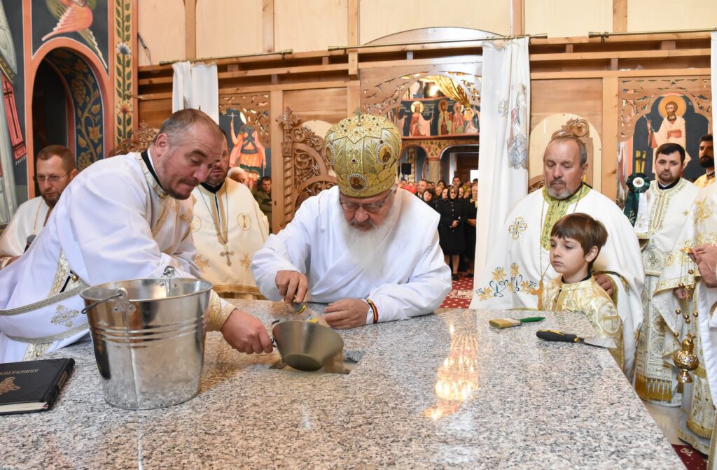 De la ora 8:30, Înaltpreasfinția Sa a săvârșit slujba de târnosire a bisericii parohiale, cu hramurile „Sfinţii Arhangheli Mihail şi Gavriil” şi „Sfântul Mare Mucenic Dimitrie, Izvorâtorul de Mir”, edificată între anii 2002-2023. La interior și exterior, lăcașul de cult a fost binecuvântat prin stropire cu apă sfinţită şi prin ungere cu Sfântul și Marele Mir, iar în piciorul Sfintei Mese au fost așezate moaște de mucenici.