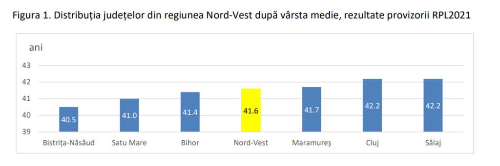 Fenomenul de îmbătrânire s-a accentuat, vârsta medie a populației rezidente pentru județul Bistrița-Năsăud crescând la 40,5 ani (față de 39,4 ani la RPL2011). Față de vârsta medie pe țară, vârsta medie a județului Bistrița-Năsăud este mai mică cu 1,9 ani. În ierarhizarea județelor după vârsta medie la RPL 2021, județul Bistrița-Năsăud se plasează pe locul 4. În cadrul Regiunii Nord-Vest vârsta medie este de 41,6 ani, județul Bistrița-Năsăud poziționându-se pe primul loc.