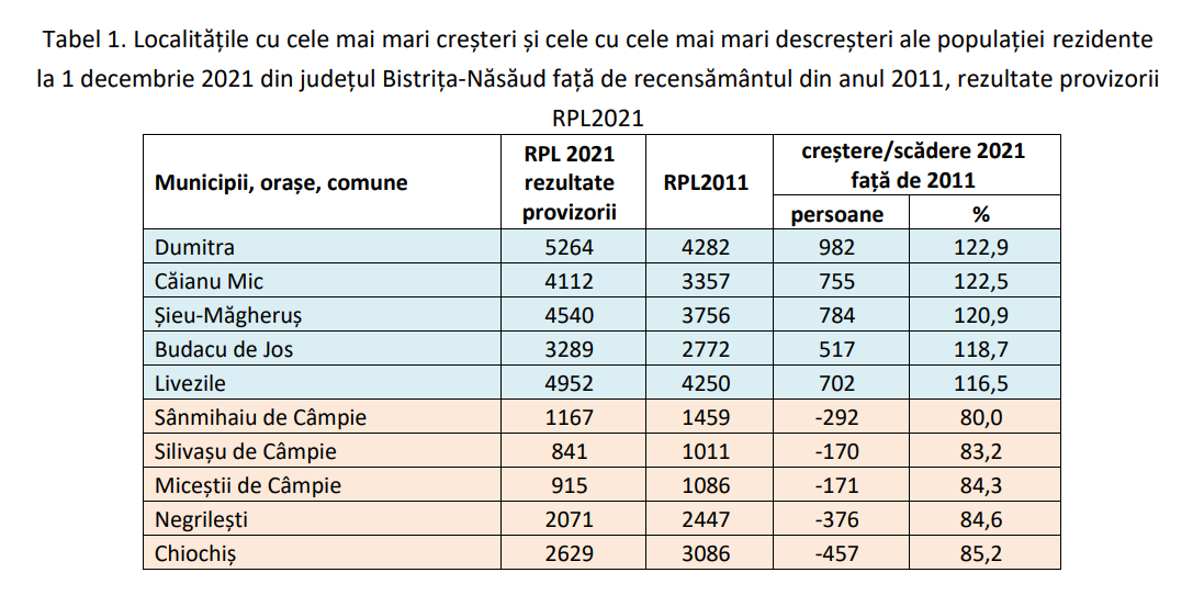 Referitor la municipii, orașe și comune, în cadrul județului Bistrița-Năsăud, localitățile care au câștigat cel mai mare număr de locuitori între cele două recensăminte, sunt municipiul Bistrița care a ajuns la o populație de 78.877 persoane (cu 3.801 persoane mai mult decât în 2011), orașul Sângeorz-Băi, cu o populație rezidentă de 10.931 persoane (cu 1.252 persoane mai mult decât în 2011) și comuna Dumitra cu o populație rezidentă de 5.264 persoane (cu 982 persoane mai mult decât în 2011). Ierarhia se modifică dacă ne referim la creșteri în valori relative. Astfel, comuna Dumitra și comuna Căianu Mic au crescut cu 122,9% față de 2011 ajungând la o populație de 5264 locuitori, respectiv 122,5% ajungând la o populație de 4112 locuitori.
