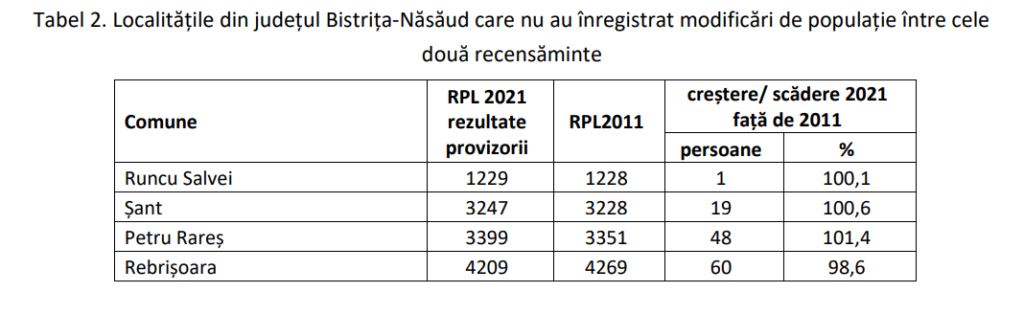 Între cele două recensăminte, și-au păstrat dimensiunea patru localități. Sunt redate în tabelul de mai jos.