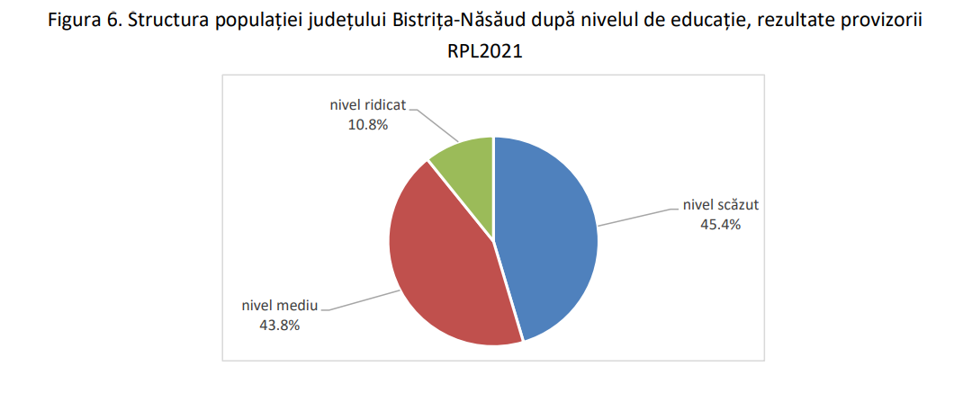 Din totalul populației rezidente a județului Bistrița-Năsăud, 45,4% nivel scăzut de educație (preșcolar, primar, gimnazial sau fără școală absolvită), 43,8% au nivel mediu (postliceal, liceal, profesional, învățământ complementar sau de ucenici) și 10,8% nivel superior. Din punctul de vedere al ponderii populaţiei rezidente cu nivel superior de educație, judeţul Bistrița-Năsăud se situează pe locul 28 în ierarhia judeţelor.