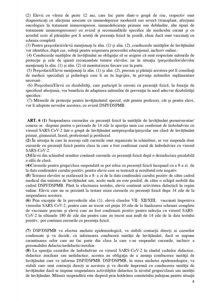 ”Pentru părinţii copiilor care refuză testarea în ziua a opta se prelungeşte învăţământul online până în ziua a paisprezecea, moment în care se întorc la şcoală. Pentru copii din clasele a VII-a, a VIII-a şi învăţământul liceal, la apariţia unui caz pozitiv în şcoală există două situaţi: copii care au fost vaccinaţi sau au trecut prin boală în ultimele 180 de zile şi fac dovada în ceea ce priveşte aflarea într-una din cele două situaţii pot continua să înveţe faţă în faţă. Ceilalţi copii trec pe învăţământ online, la fel ca şi în clasele primare şi până la clasa a VI-a, pentru 14 zile, dar cu posibilitatea testării şi revenirii la şcoală începând cu ziua a opta”, a arătat ministrul Sănătăţii.