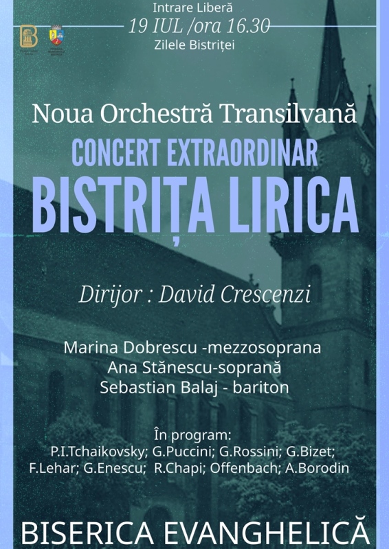 Un eveniment muzical de excepție va avea loc la Bistrița cu ocazia Zilelor orașului. Sâmbătă, 19 iulie, de la ora 16:30, Biserica Evanghelică găzduiește concertul ”Bistrița Lirică”, un spectacol extraordinar susținut de Noua Orchestră Transilvană, sub bagheta celebrului dirijor David Crescenzi.