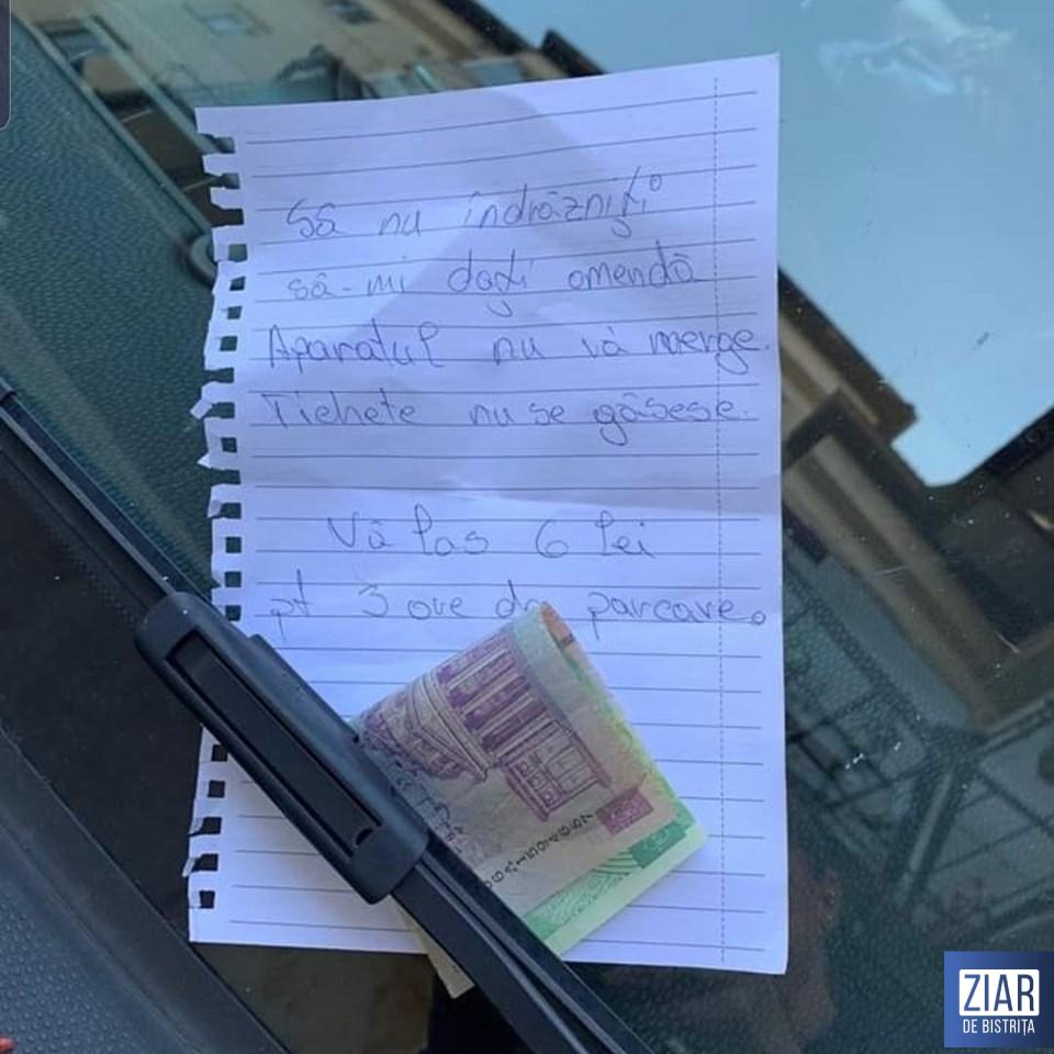Un astfel de exemplu este și cel al unui cetățean care le-a lăsat polițiștilor locali un mesaj în parbriz și care a devenit viral pe rețele de socializare. ”Să nu îndrăzniți să-mi dați amendă. Aparatul nu vă merge, tichete nu se găsesc. Vă las 6 lei pentru 3 ore de parcare”, a scris cetățeanul pe un bilet pe care l-a pus în parbrizul mașinii, alături de suma de 6 lei.