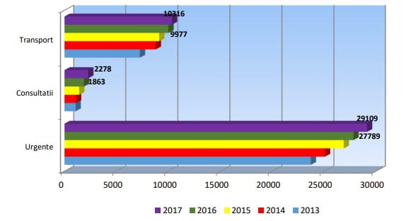 Din volumul total de solicitări înregistrate în anul 2017, cele mai multe (41.716, adică aproximativ 70 la sută) au fost deservite de echipajele ale Serviciului Județean de Ambulanță Bistrița-Năsăud, iar restul au fost fie alocate echipajelor SMURD, fie au fost sfaturi medicale sau reveniri și informări.