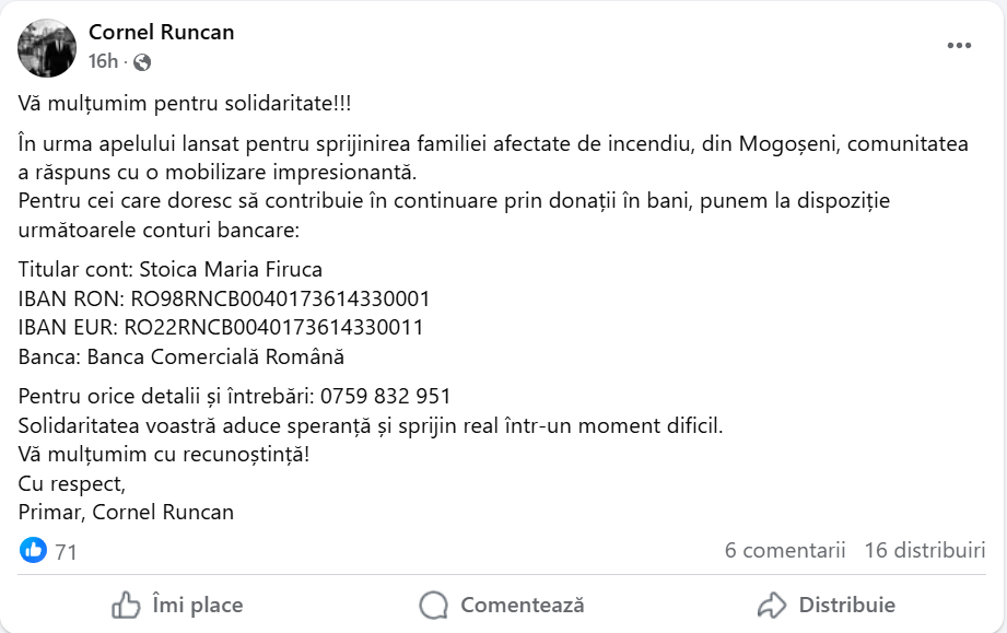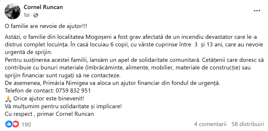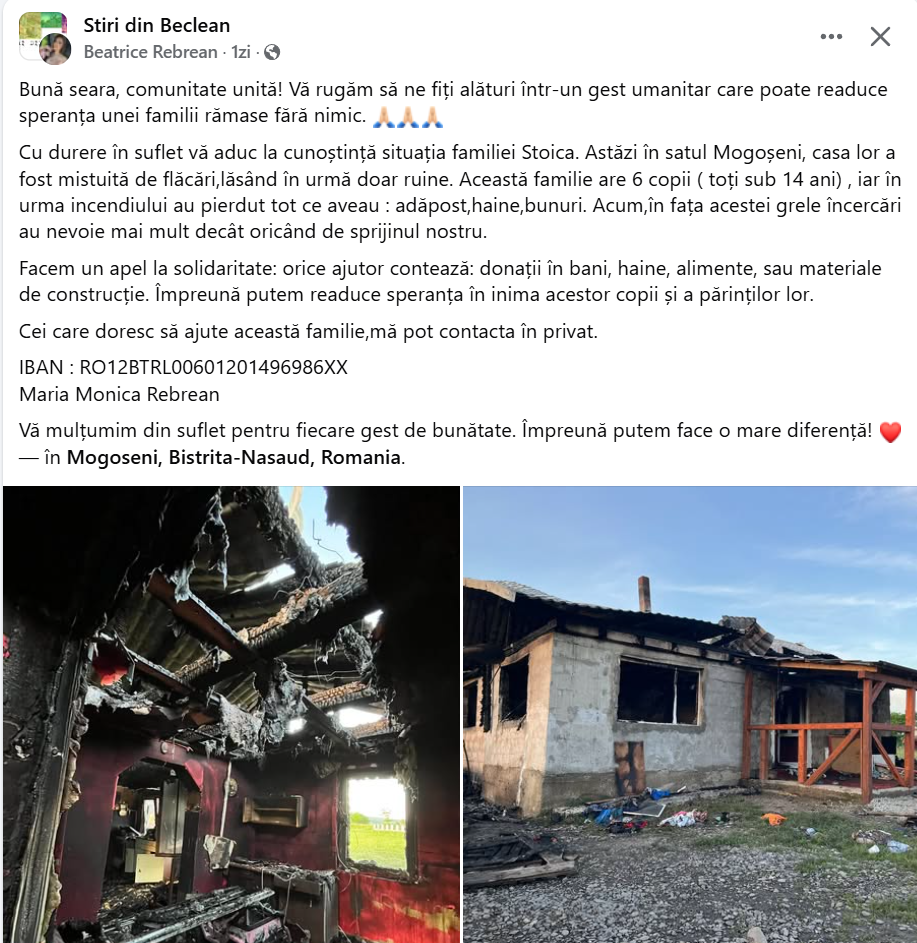 Comunitatea locală a făcut apel la solidaritate pentru a ajuta familia greu încercată. Este nevoie urgentă de sprijin financiar, haine, alimente, materiale de construcție sau orice alt ajutor concret.