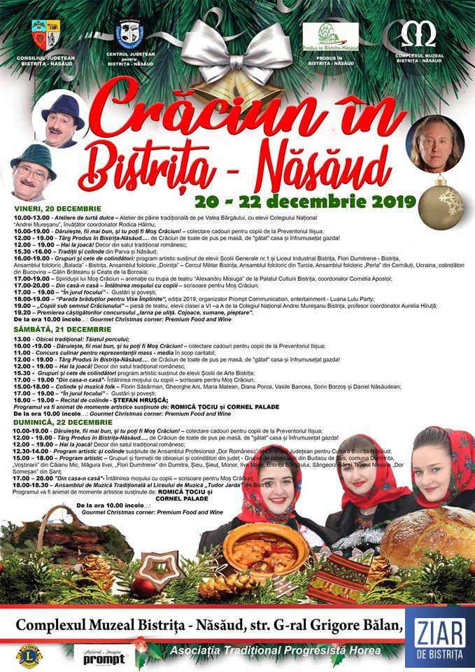 ”Peste oraș s-a așternut iarna, în casă miroase a cozonaci, bradul e împodobit și-n suflet e deja sărbătoare. Vă invităm la o nouă ediție Crăciun în Bistrița – Năsăud care va avea loc în curtea Complexului Muzeal Bistrița în perioada 20 – 22 decembrie, să ne bucurăm împreună de magia sărbătorilor de iarnă alături de cei dragi într-un cadru de poveste. Tradițiile și obiceiurile specifice zonei le transpunem și le aducem mai aproape de copii, părinți, bunici prin spectacole la scenă, concert de colinde, proiecții de film, ateliere creative pentru toate vârstele unde cei mici se vor distra și vor învăța prin joc și joacă, iar cei mari se vor relaxa. Avem invitați de seamă unul și unul, Romică Țociu și Cornel Palade, și colindele vor răsuna în zări într-un concert extraordinar al lui Ștefan Hrușcă. Ne vom ospăta cu bunătăți tradiționale, dulcegării și fel de fel de produse gustoase și băuturi alese care să vă țină de cald în timp ce îl așteptăm pe Moș Crăciun să vină să răsplătească colindătorii și copiii cuminți. Tot în cadrul târgului veți găsi articole vestimentare cu tradiție, chițibușuri, mâncăruri să faceți masa de Crăciun bogată, decorațiuni tematice și multe alte surprize”, anunță Complexul Muzeal Bistrița-Năsăud.