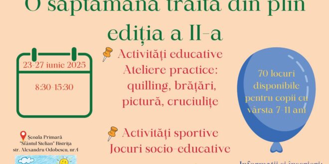 În perioada 23–27 iunie, Școala Primară ”Sfântul Stelian” din Bistrița găzduiește cea de-a doua ediție a proiectului ”O săptămână trăită din plin”, un program special conceput pentru copiii cu vârste cuprinse între 7 și 11 ani.