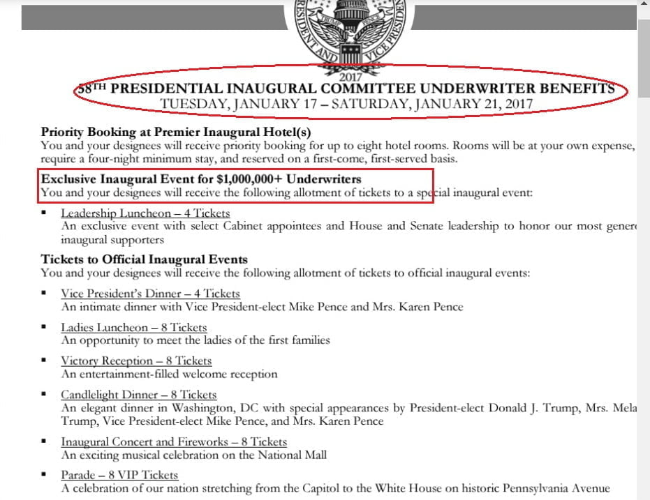 New York Times arată că o astfel de cină costă între 500.000 și 1 milion de dolari. În perioada instalării noului președinte. Casa Albă a oferit această posibilitate tuturor simpatizanților.