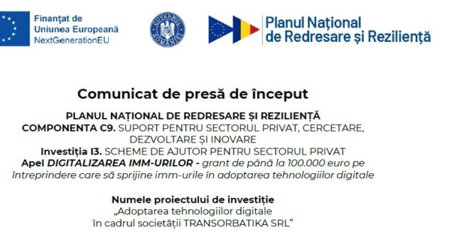 TRANSORBATIKA anunță începerea proiectului cu titlul „Adoptarea tehnologiilor digitale”, conform contractului de finanțare nr. 681.1/i3/c9 din 15.05.2025 .
