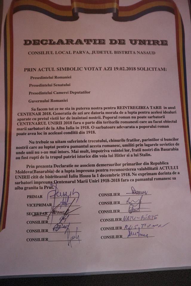 Primăria Parva a semnat o declaraţie simbolică de unire cu Republica Moldova, fiind prima comună din România care face acest gest. Ioan Strugari, primarul comunei Parva, alături de viceprimar, secretarul primăriei şi de către cei nouă consilieri locali au semnat documentul de unire cu Republica Moldova.