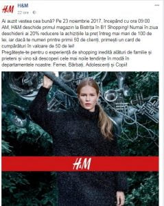 „Ai auzit vestea cea bună? Pe 23 noiembrie 2017, începând cu ora 09:00, H&M deschide primul magazin la Bistrița în B1 Shopping! Numai în ziua deschiderii ai 20% reducere la achizițiile la preț întreg mai mari de 100 de lei, iar dacă te numeri printre primii 50 de clienți, primești un card de cumpărături în valoare de 50 de lei! Pregătește-te pentru o experiență de shopping inedită alături de familie și prieteni și vino să descoperi cele mai noile tendințe în modă în departamentele noastre: Femei, Bărbați, Adolescenți și Copii!” precizează reprezentanții companiei H&M, magazinul ancoră al B1 Retail Park.
