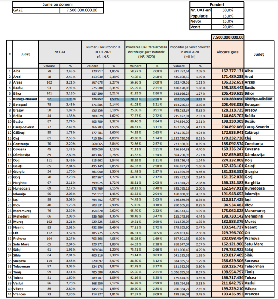 Potrivit Ministerului Dezvoltării, criteriile de selectare care au fost luate în considerare la alocarea sumelor au fost numărul de unităţi administrativ-teritoriale dintr-un judeţ, numărul de locuitori, ponderea localităţilor (UAT) unde gospodăriile nu sunt racordate la reţeaua de distribuţie a gazelor naturale şi impozitul pe venit colectat – a spus ministrul, subliniind că, la alocarea fondurilor disponibile prin Programul „Anghel Saligny”, au contat doar aceste date statistice.