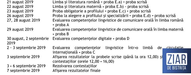 Prima probă scrisă, cea la Limba și literatura română, va avea loc pe 21 august. În următoarea zi, pe 22 august se va desfășura proba scrisă la Limba și literatura maternă, iar pe 23 august va avea loc proba obligatorie a profilului. Ultima probă scrisă va fi susținută pe 26 august, fiind vorba despre proba la alegere a profilului și specializării.