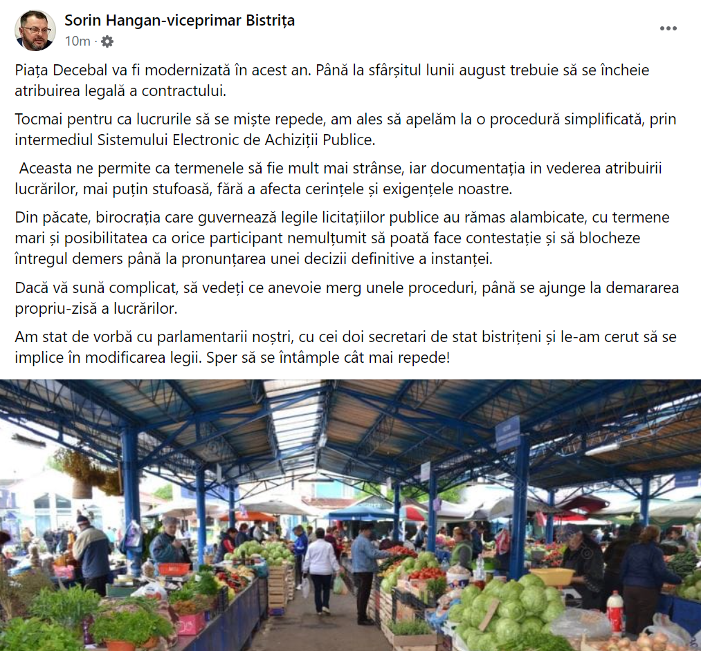”Din păcate, birocrația care guvernează legile licitațiilor publice a rămas alambicată, cu termene mari și posibilitatea ca orice participant nemulțumit să poată face contestație și să blocheze întregul demers până la pronunțarea unei decizii definitive a instanței. Dacă vă sună complicat, să vedeți ce anevoie merg unele proceduri, până se ajunge la demararea propriu-zisă a lucrărilor. Am stat de vorbă cu parlamentarii noștri, cu cei doi secretari de stat bistrițeni și le-am cerut să se implice în modificarea legii. Sper să se întâmple cât mai repede”, a completat viceprimarul Bistriței.