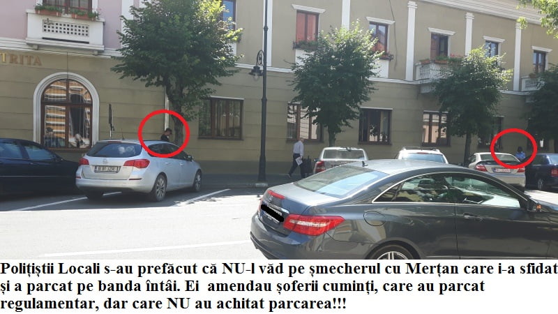 Situație absurdă a avut loc pe strada Gheorghe Șincai, unde sub nasul polițiștilor locali a parcat un șmecher cu Mercedes, care și-a lăsat mașina cu avariile puse, pe prima bandă și a intrat la farmacie! Asta în timp ce doi polițiști locali amendau șoferii parcați regulamentar, dar care NU au achitat taxa de staționare. După o staționare de aproximativ 1 minut, șoferul Mercedesului a demarat în trombă, de sub nasul polițiștilor locali, care NU s-au sinchisit nici măcar să-i fotografieze numărul de înmatriculare.