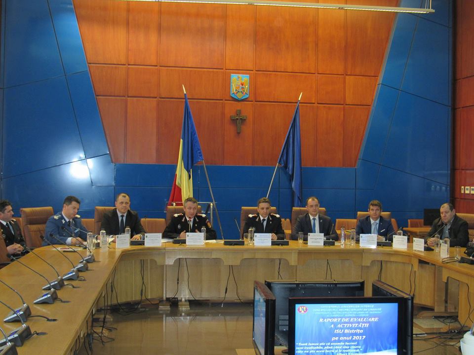 Evaluarea activității ISU Bistrița – Năsăud în anul 2017 a avut loc în Sala Mare a Palatului Administrativ din municipiul Bistrița, în prezența colonelului Radu Cristian – prim adjunct al inspectorului general, a prefectului Ovidiu Victor Frenț, a subprefectului Ciprian Ceclan Oprea și a comandanților celorlalte structuri ale M.A.I., principalii parteneri ai pompierilor militari bistrițeni” a precizat Marius Rus, purtător de cuvânt al instituției.