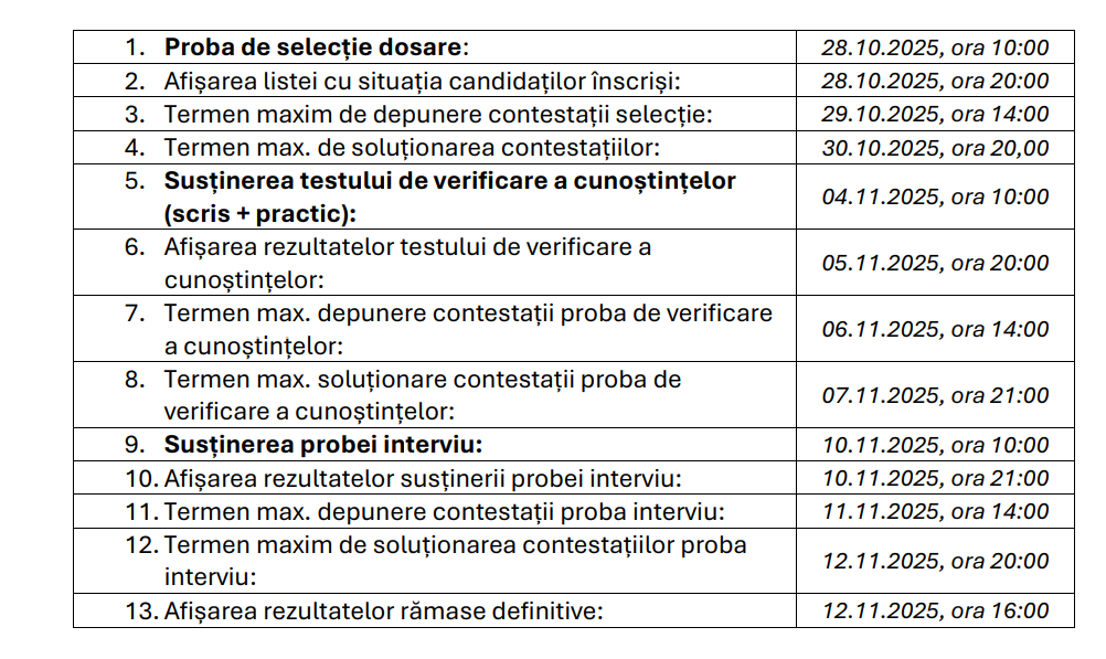 Dosarele de concurs se depun până la data de 27 octombrie (interval orar 09:00 – 14:00). Dosarele care se depun în afara acestui interval de timp, nu vor fi acceptate.