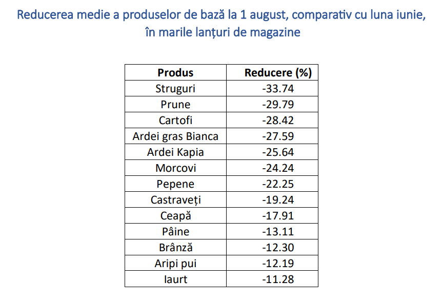 „Astfel, comparativ cu preţurile medii din luna iunie, la 1 august, cele mai mari reduceri aplicate de marile lanţuri de retail s-au înregistrat la fructe şi legume. Preţul strugurilor a înregistrat o scădere medie de aproape 34%, fiind urmat de prune, al căror preţ a scăzut cu circa 30%, cartofi (28,4%), ardei gras (27,5%), ardei Kapia (25,6%), morcovi (24,2%) şi pepene (22,2%)„, se precizează într-un comunicat al instituției.