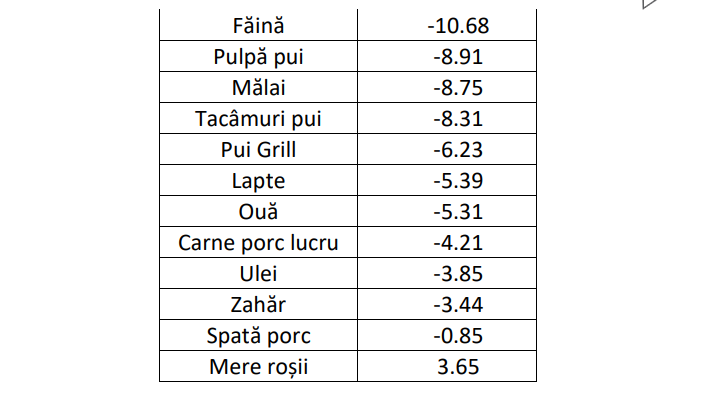 Celelalte produse care se regăsesc în coşul de bază, precum pâinea, uleiul, ouăle, zahărul şi mălaiul au înregistrat şi ele reduceri de preţ.