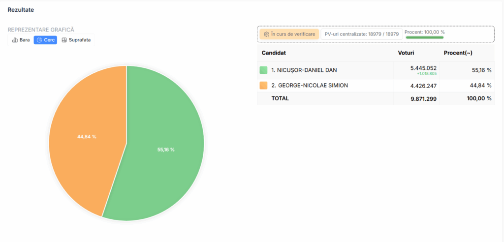 După centralizarea tuturor celor 20.085 de procese verbale din țară și din străinătate, datele AEP arată că, la cel de-al doilea tur de scrutin al alegerilor prezidențiale, Nicușor Dan, candidat independent, a obținut 6.168.642 voturi, un procent de 53,60%.