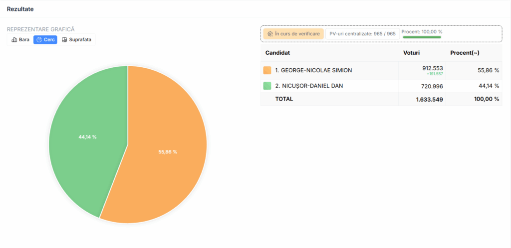 Votul în diaspora, după centralizarea celor 965 de procese verbale, a arătat în felul următor: George Simion – 55,86%, Nicușor Dan – 44,14%.