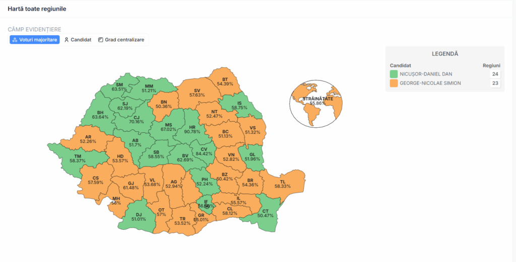Candidatul independent Nicușor Dan a câștigat în 24 de regiuni, iar candidatul AUR, George Simion, în 23 de regiuni.
