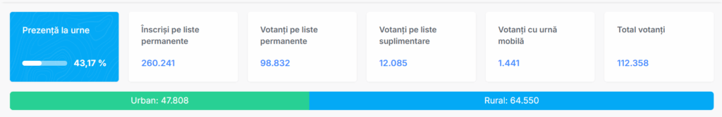 La nivel județean au votat 112.358 de persoane, din care 98.832 au votat pe liste permanente, 12.085 pe liste suplimentare și 1.441cu urna mobilă.