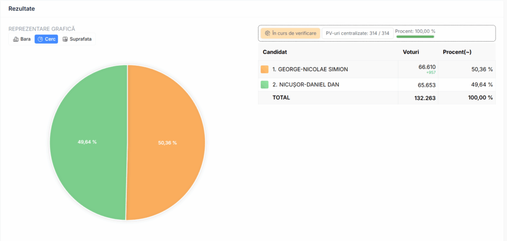 La cel de-al doilea tur al alegerilor prezidențiale, în Bistrița-Năsăud, după centralizarea proceselor-verbale din toate cele 314 secții de votare din județ, George Simion, candidatul AUR, a obținut 66.610 voturi (50,36%), arată datele publicate pe site-ul Autorității Electorale Permanente.
