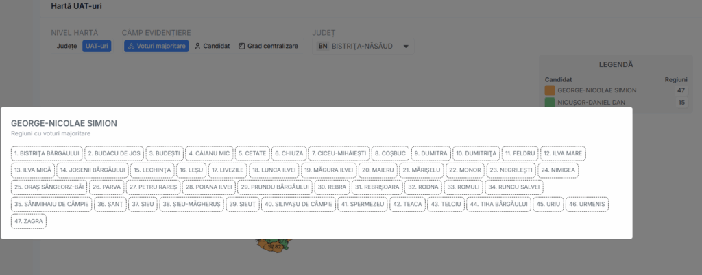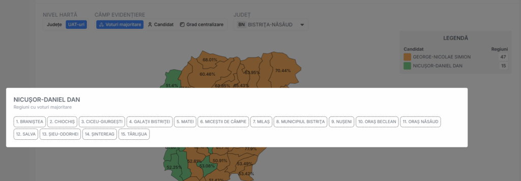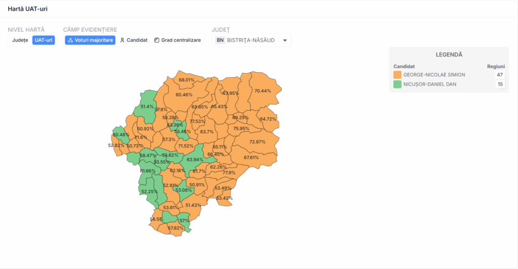 Pe unități administrativ-teritoriale, situația votului din județul Bistrița-Năsăud arată că George Simion a câștigat în 47 de orașe și comune, printre care și orașul Sângeorz-Băi, în vreme ce Nicușor Dan a câștigat în 15, printre care și orașele Bistrița, Beclean și Năsăud.