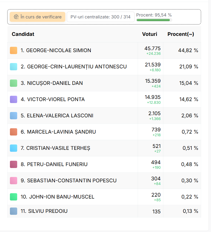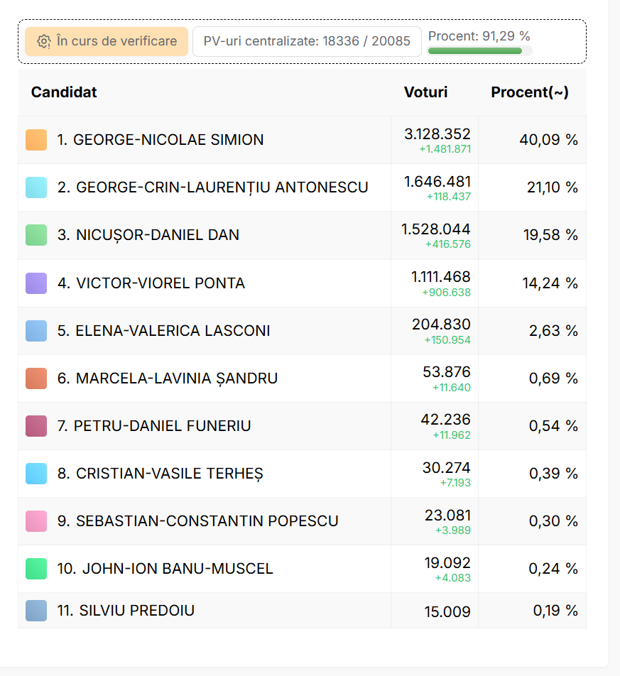 La nivel național, după centralizarea a 18.336 de procese verbale (91,29%), George Simion se află pe primul loc cu 3.128.352 voturi (40,09%). Pe locul al doilea se află Crin Antonescu, cu 1.646.481 voturi (21,10%), urmat de candidatul independent Nicușor Dan cu 1.528.044 voturi (19,58%) și candidatul independent Victor Ponta cu 1.111.468 voturi (14,24%).