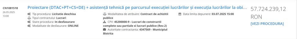 Potrivit anunțului postat în Sistemul Electronic de Achiziții Publice, valoarea totală estimată a contractului de lucrări este de 57.724.239,12 lei fără TVA, din care 1.338.822,15 lei fără TVA pentru partea de proiectare, 726.249,31 lei fără TVA pentru asistență tehnică și 55.659.167,66 lei fără TVA pentru execuția lucrărilor.