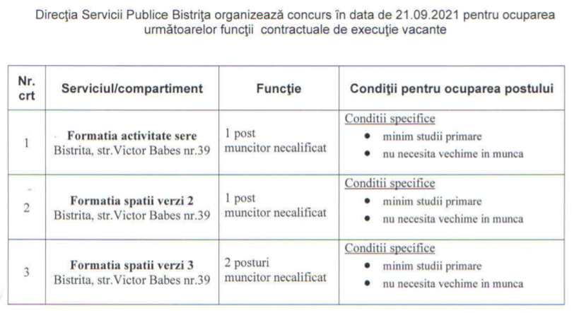 Potrivit anunțului de angajare postat pe pagina oficială a Primăriei Bistrița, cele patru posturi sunt disponibile la compartimentele Sere și Spații verzi, iar candidații nu necesită vechime în muncă.