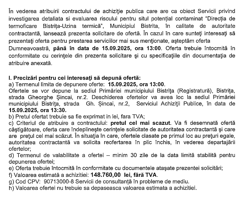 Primăria municipiului Bistrița a lansat o procedură de achiziție pentru servicii de investigare detaliată și evaluare a riscului pentru situl potențial contaminat ”Direcția de termoficare Bistrița – Uzina termică”, amplasat pe strada Zefirului nr. 1.