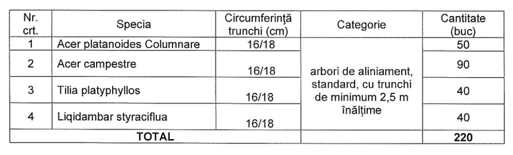 ”În vederea asigurării viabilității și a stării fitosanitare conforme, arborii vor proveni din producţie autohtonă sau din zone cu condiţii pedoclimatice și de regim pluviometric similare cu cele ale județului Bistriţa-Năsăud. Toate exemplarele vor avea rădăcinile în balot de pământ ambalat sau containerizat. Circumferința trunchiului la înălţimea de 1 m va fi exprimată în cm”, se arată în caietul de sarcini aferent procedurii municipalității.