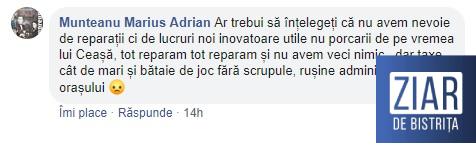 Ar trebui să înțelegeți că nu avem nevoie de reparații ci de lucruri noi, inovatoare, utile nu porcării de pe vremea lui Ceașă, tot reparăm, tot reparăm și nu avem veci nimic, dar taxe cât de mari și bătaie de joc fără scrupule, rușine administratorilor orașului”, a comentat un alt cetățean – Marius Adrian Munteanu.