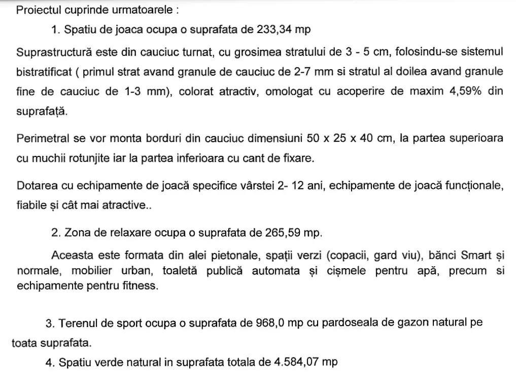 Astfel, se dorește amenajarea unui spațiu de joacă în suprafață de circa 230 de metri pătrați, a unei zone de relaxare cu o suprafață de circa 280 de metri pătrați, a unui teren de sport de circa 960 de metri pătrați și a unui spațiu verde de peste 4.500 de metri pătrați.