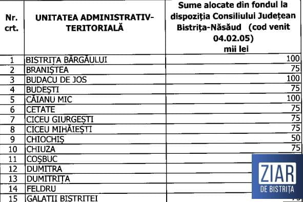 Cele 58 de unități administrativ-teritoriale din județul Bistrița-Năsăud vor primi diferite sume de bani de la Consiliul Județean Bistrița-Năsăud pentru asigurarea cheltuielilor de funcționare.