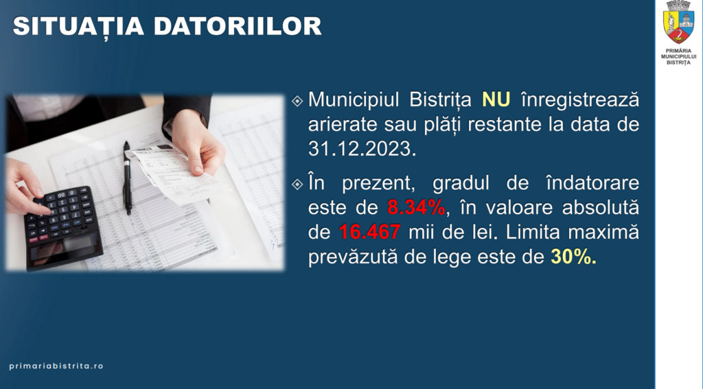 Primarul Ioan Turc a subliniat că municipiul Bistrița nu înregistrează arierate sau plăţi restante la data de 31.12.2023. Gradul de îndatorare e de 8,34%, iar limita maximă prevăzută de lege pentru îndatorare este de 30%.