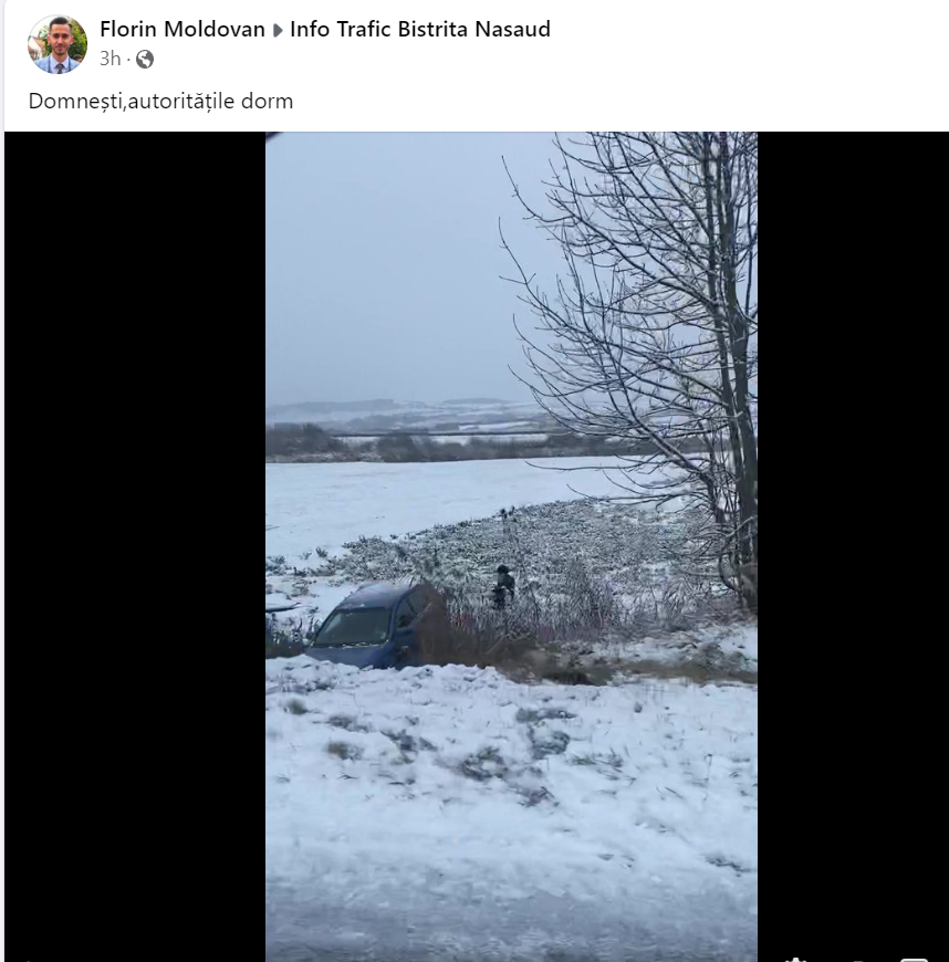 Pe de altă parte, șoferii au semnalat probleme și pe alte drumuri din județ. Spre exemplu, pe grupul Info Trafic Bistrița-Năsăud de pe Facebook, șoferii s-au plâns că partea carosabilă era acoperită cu zăpadă și pe DJ 154, unde o mașină a derapat și a ajuns în șanț.