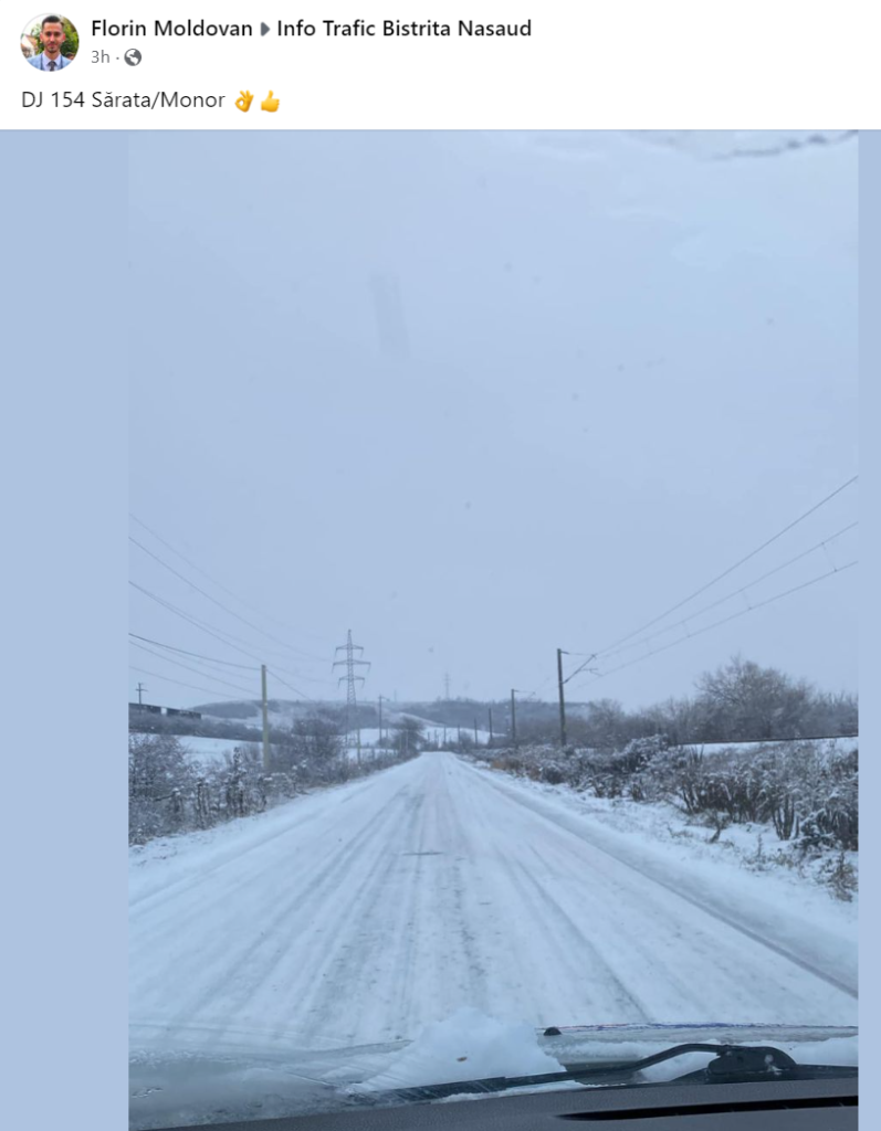 Pe de altă parte, șoferii au semnalat probleme și pe alte drumuri din județ. Spre exemplu, pe grupul Info Trafic Bistrița-Năsăud de pe Facebook, șoferii s-au plâns că partea carosabilă era acoperită cu zăpadă și pe DJ 154, unde o mașină a derapat și a ajuns în șanț.