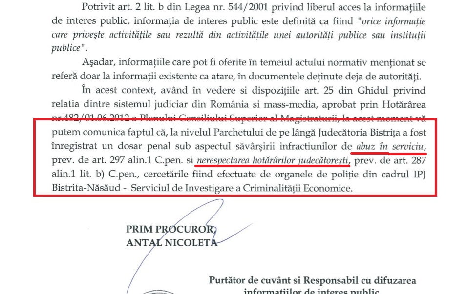 Într-un final, procurorii bistrițeni au început urmărirea penală pentru abuz în serviciu și ne-respectarea unei hotărâri judecătorești. Pe surse, cel vizat de procurori ar fi primarul Ovidiu Crețu. Desigur, în cadrul cercetării penale, persoana cercetată are prezumția de nevinovăția.