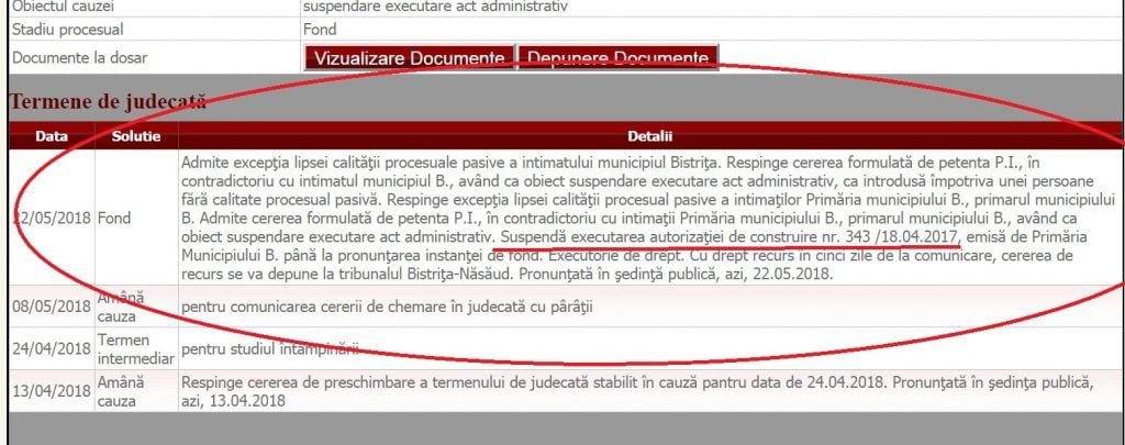 Este un precedent la nivelul administrației publice faptul că o hotărâre judecătorească este ignorată pur și simplu și în loc să fie pusă în aplicare este interpretată de juriștii Primăriei Bistrița. Lucrările NU au fost sistate și cât timp autorizația de construire a fost suspendată, s-au mai ridicat 3 ETAJE. Într-un final a început urmărirea penală pentru abuz în serviciu și nerespectarea unei hotărâri judecătorești și cazul se anunță a fi unul interesant și delicat, fiind în joc reputația unui primar și interesele de milioane de euro ale constructorului, care au fost încurcați de un magistrat care a îndrăznit să SUSPENDE o autorizație de construire eliberată de Primăria Bistrița!