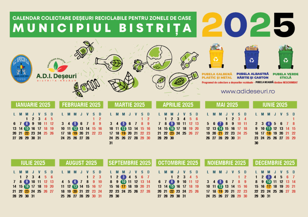 Calendarul de colectare a deșeurilor în fiecare localitate din județul Bistrița-Năsăud este disponibil pe www.adideseuribn.ro sau la tel. 0263.944 – Dispecerat Supercom.