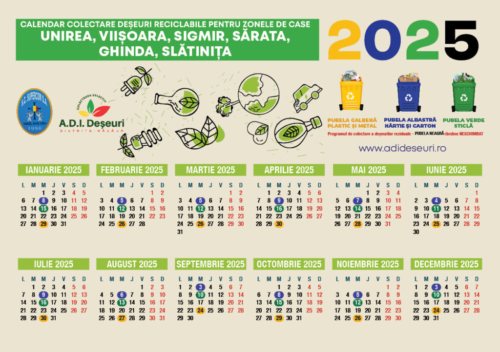 Începând din acest an, ziua de colectare a pubelei galbene pentru toate localitățile componente – Unirea, Viișoara, Sigmir, Sărata, Slătinița și Ghinda – este ultima zi de miercuri din lună.