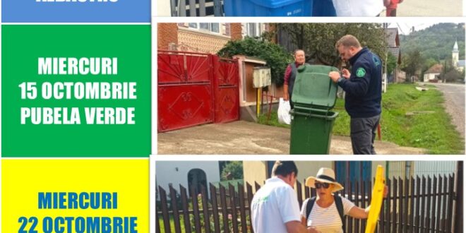 • 29 octombrie – pentru toate localitățile componente – pubela galbenă pentru deșeurile reciclabile din plastic/metal.