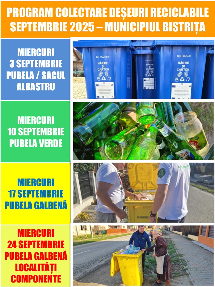 ADI Deșeuri Bistrița-Năsăud a publicat programul de colectare a deșeurilor reciclabile din municipiul Bistrița și din localitățile componente, valabil pentru luna septembrie.