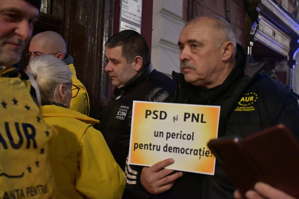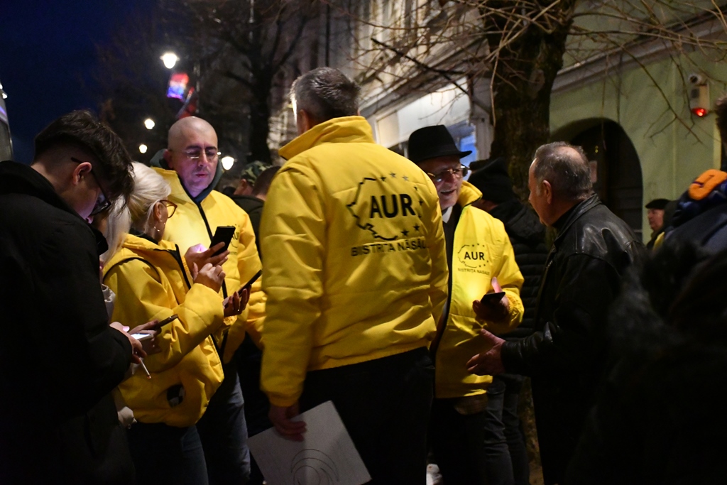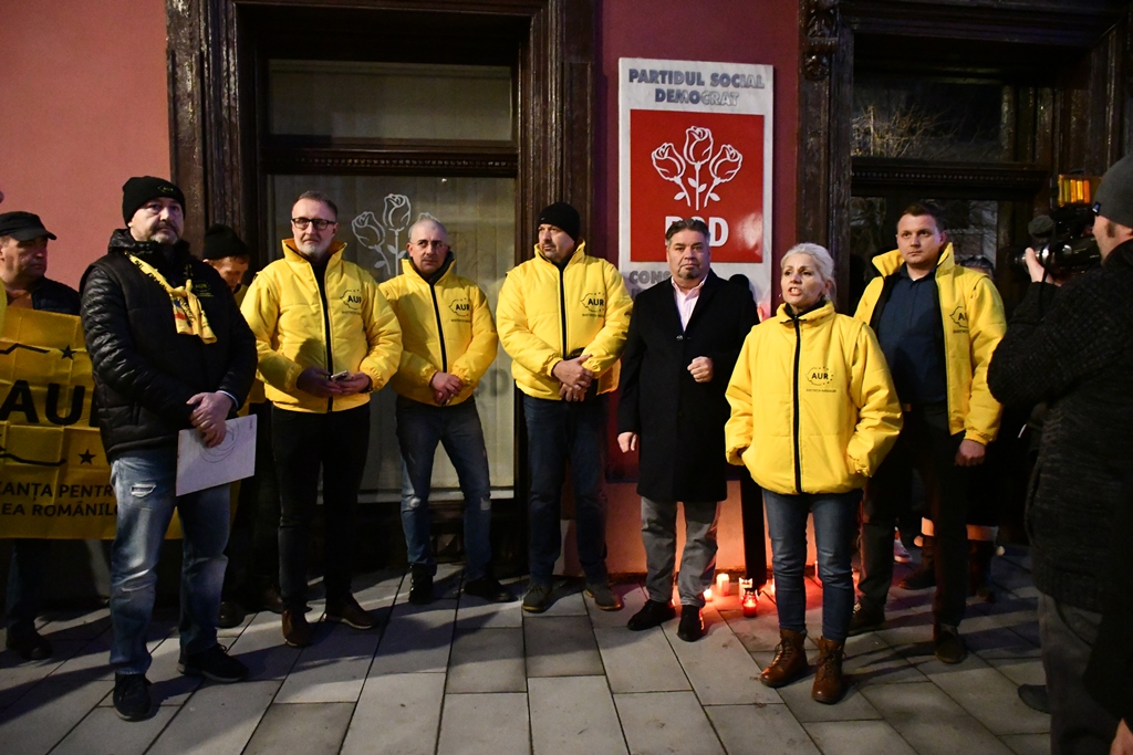 Aproximativ 100 de reprezentanți ai AUR Bistrița-Năsăud au protestat, miercuri seara, în fața sediului organizației județene a PSD, nemulțumiți de posibilitatea comasării alegerilor europarlamentare cu cele locale.