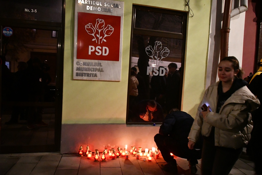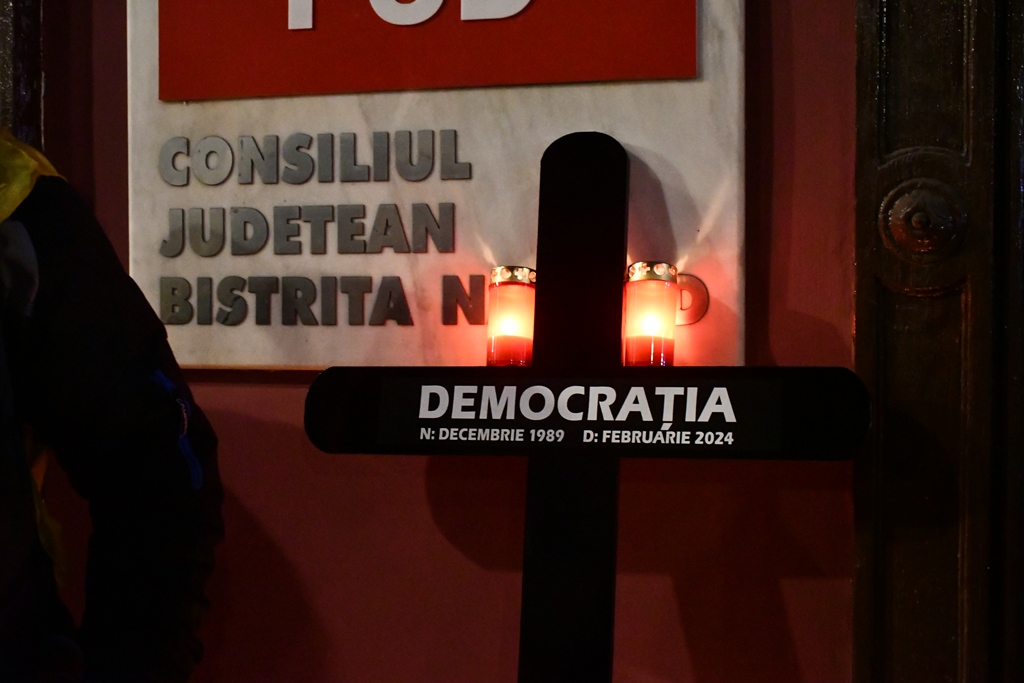 Reprezentanții AUR acuză PNL și PSD că au ”ucis democrația”. Cu acest pretext, au amplasat în fața sediului PSD Bistrița-Năsăud zeci de lumânări și o cruce pe care era scris ”Democrația”, afirmând că asistă la înmormântarea democrației.