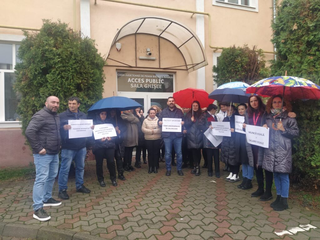 Funcționarii Casei Județene de Pensii Bistrița-Năsăud au organizat astăzi un protest spontan, nemulțumiți în principal de condițiile de salarizare! Aproximativ 30 de angajați din Bistrița au protestat în fața sediului de pe Bulevardul Republicii.
